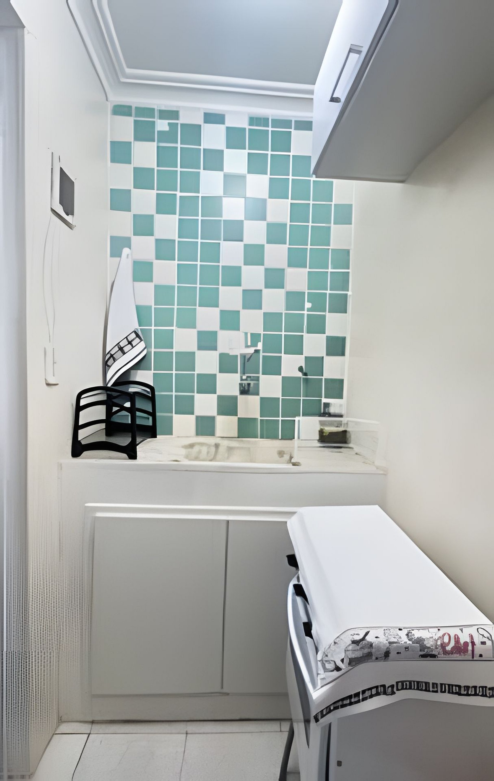 Há uma cozinha compacta com frigobar, microondas, air fryer e máquina de café da Nespresso.