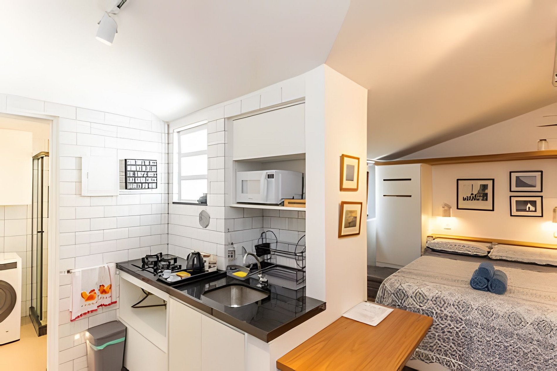 Lugar super agradável, aconchegante e silencioso. Há uma mesa e cadeiras de escritório para trabalhos home-office, que se abre caso necessário. - Ar condicionado - Wi-Fi de alta velocidade. - Blackout nas janelas. - TV de 42 polegadas / Netflix / Net HD Há uma cozinha compacta com fogão, geladeira e microondas.. Talheres, pratos, copos, taças de vinho, abridor de vinho, entre outros utensílios. Chuveiro quente e frio. Máquina de lavar e secar roupa. Secador de cabelo e ferro de passar roupa à disposição.